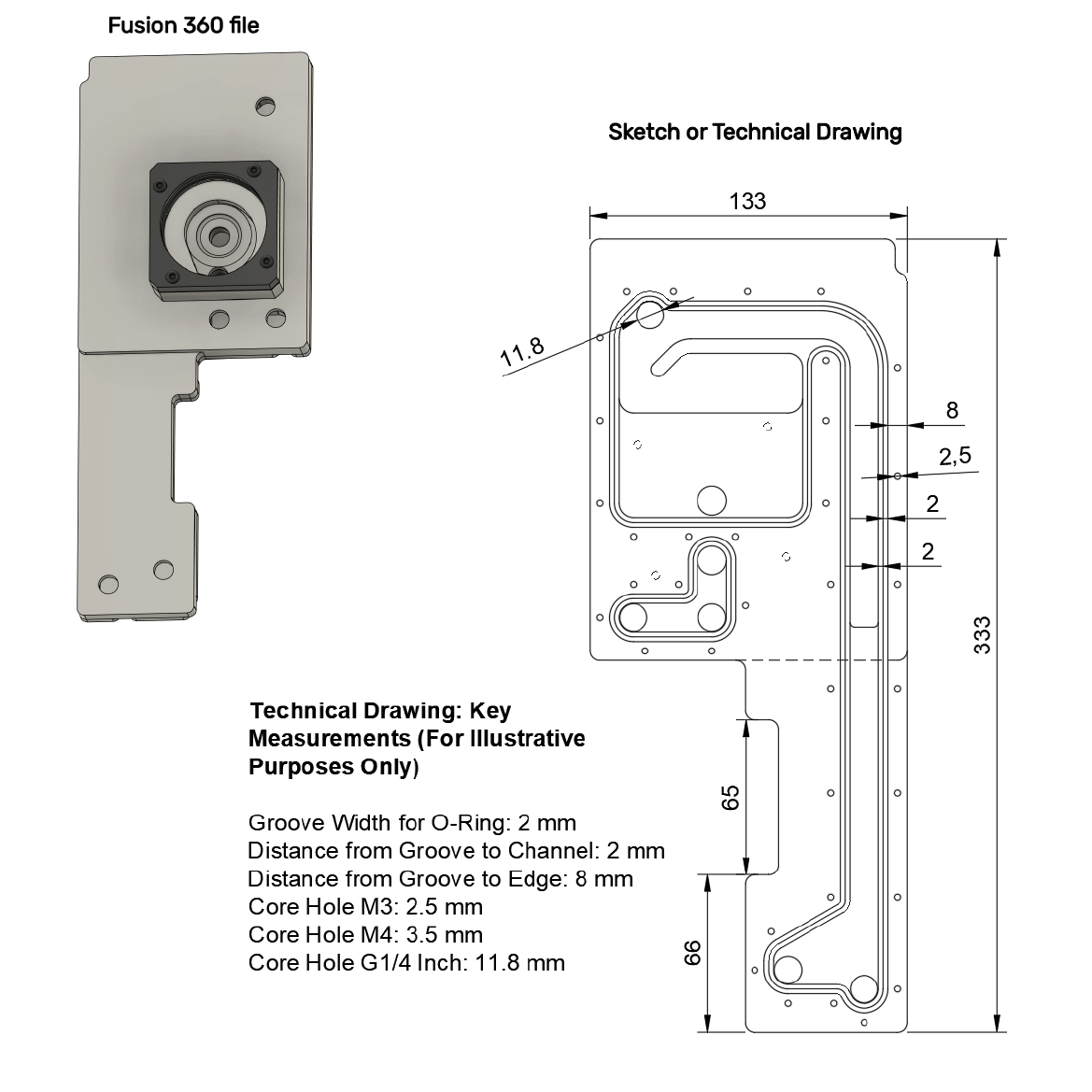 We offer you the opportunity to have custom water cooling solutions tailored to your preferences and requirements. In order for us to best realize your vision, we require a sketch or technical drawing with precise measurements. Alternatively, you can also send us a 3D model in Fusion 360 file.