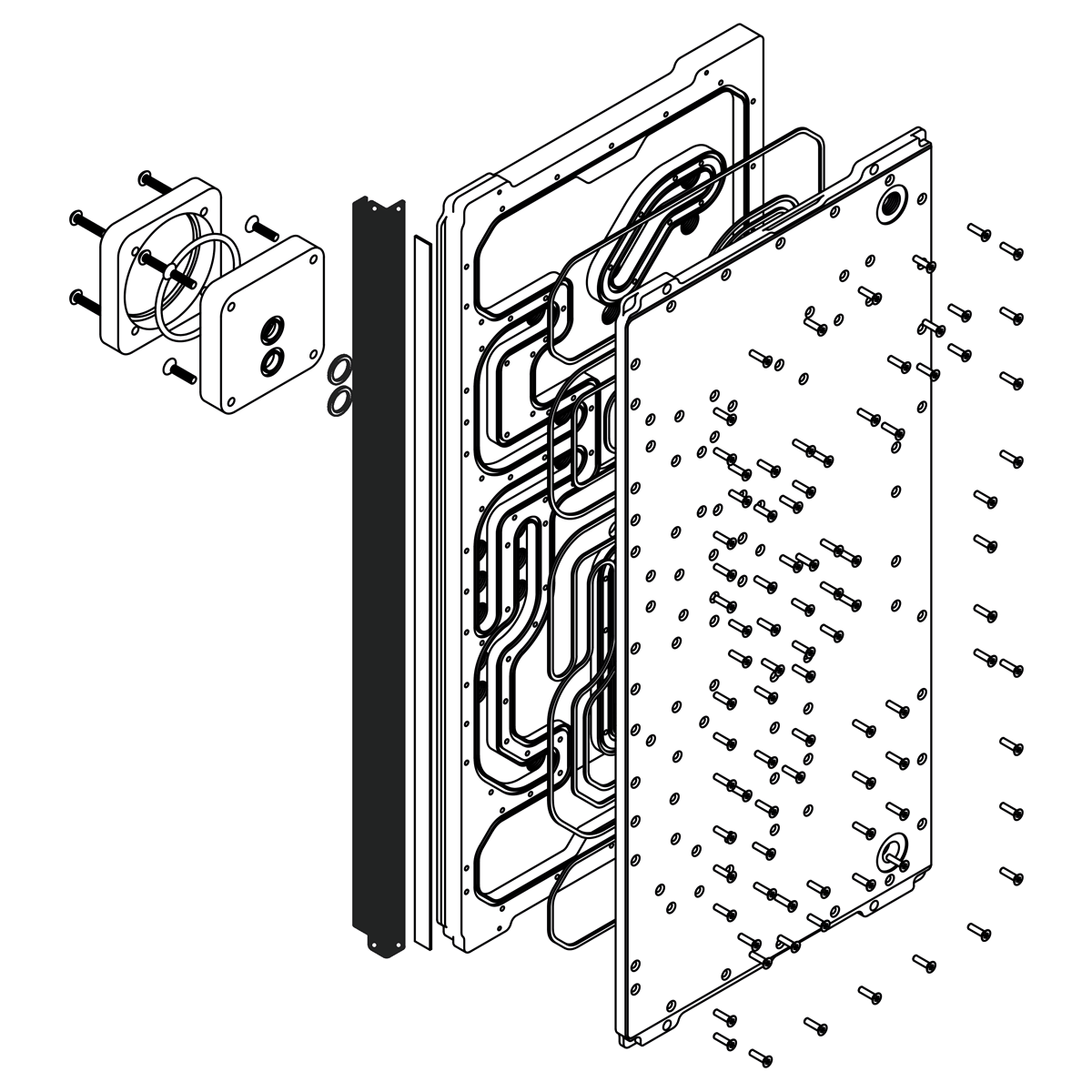 The Crosscool II consists of several high quality parts. Black stainless steel screws, acrylic front and back plate (CNC machined), acetal D5 ring, EPDM gaskets and UV printed logo plate linking to Lian Li.