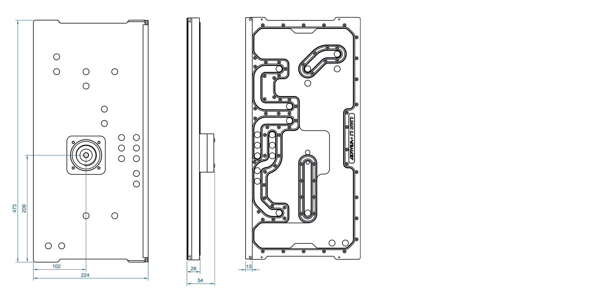 Support for a maximum of 3 × 420 mm radiators. Using the distroplate results in the following maximum radiator thicknesses: Top: 78 mm, Bottom: 78 mm, Side: 48 mm
