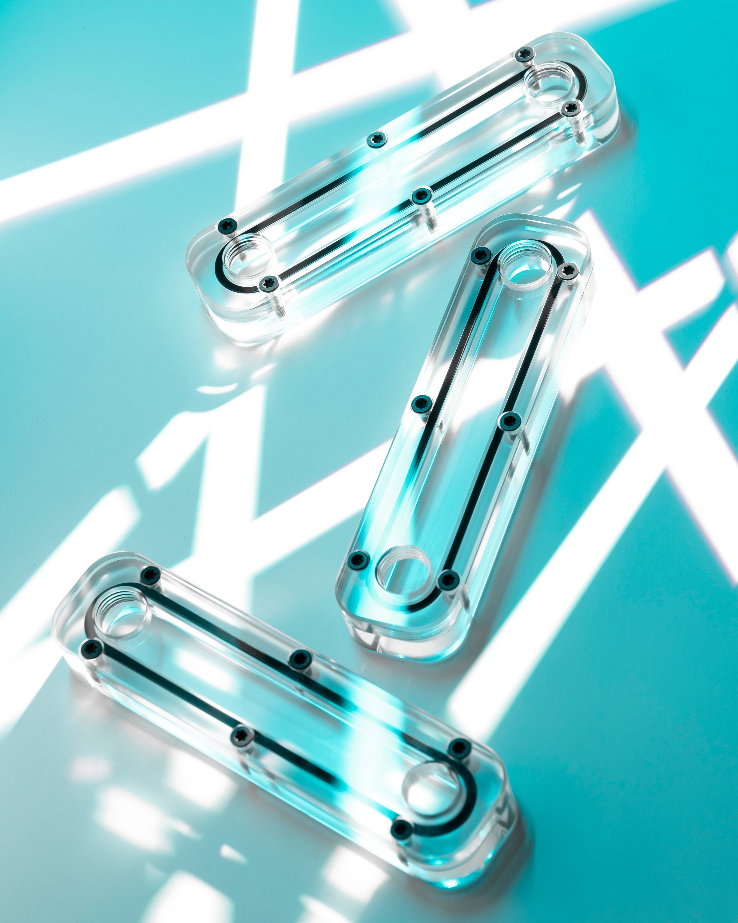 The CNC-machined top made from cast acrylic (PMMA) provides a clear view of the internal cooling structure — also thanks to the ports being positioned on the right-hand side of the CenPro. The terminal is made of CNC-milled acetal, a particularly durable material ideal for the IN & OUT ports of the block.